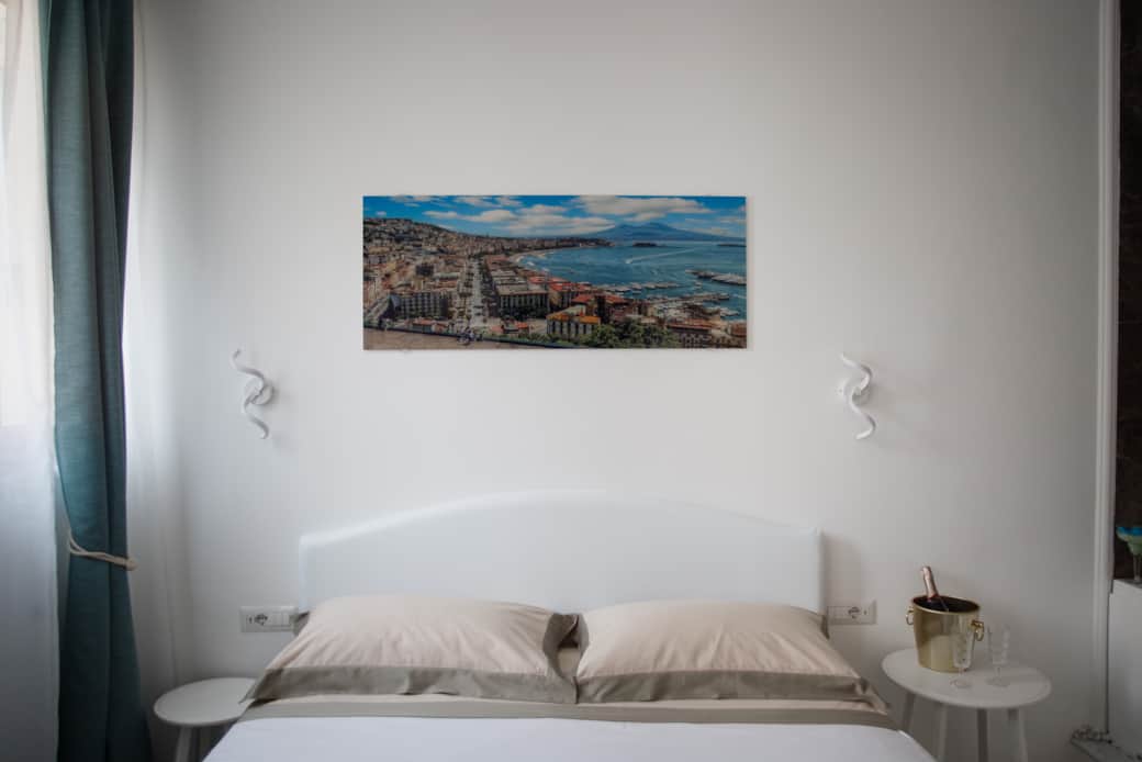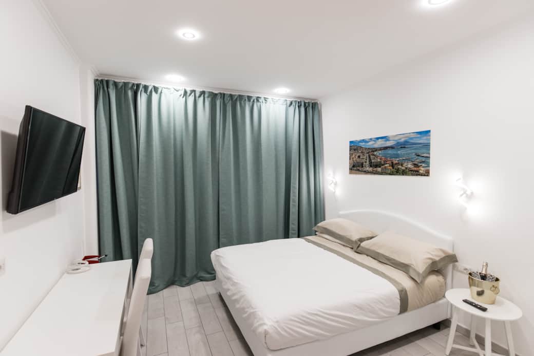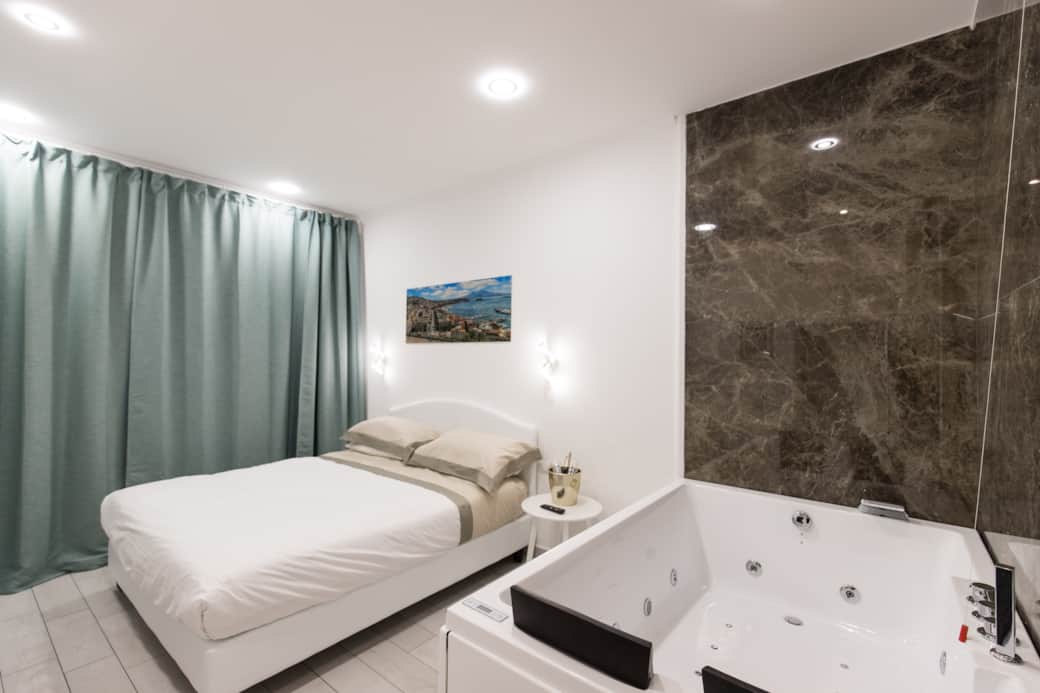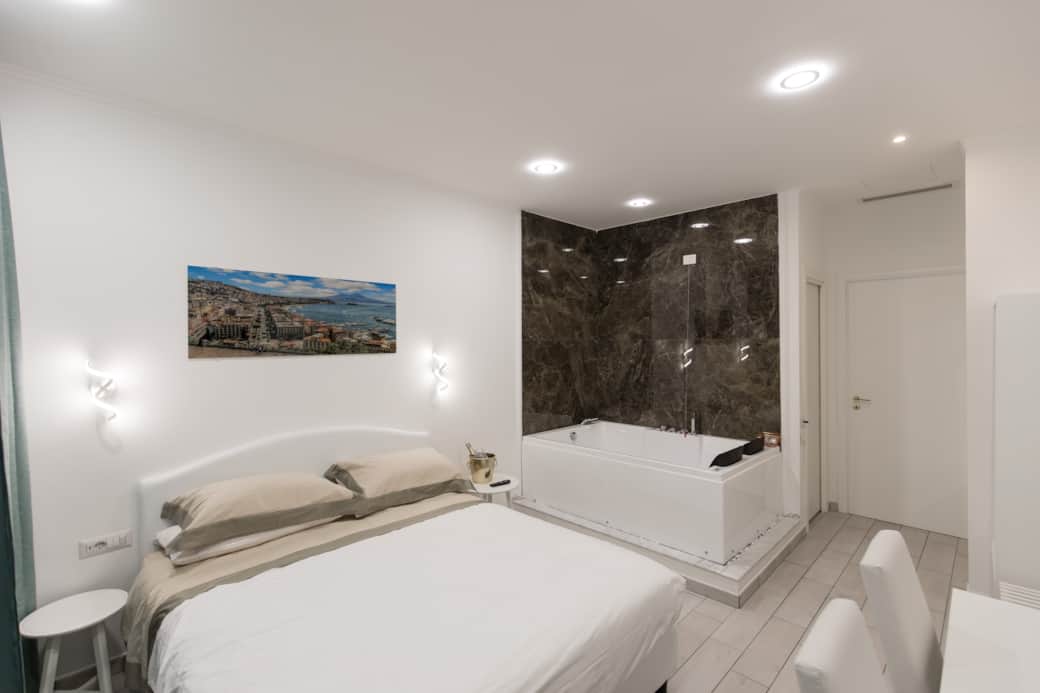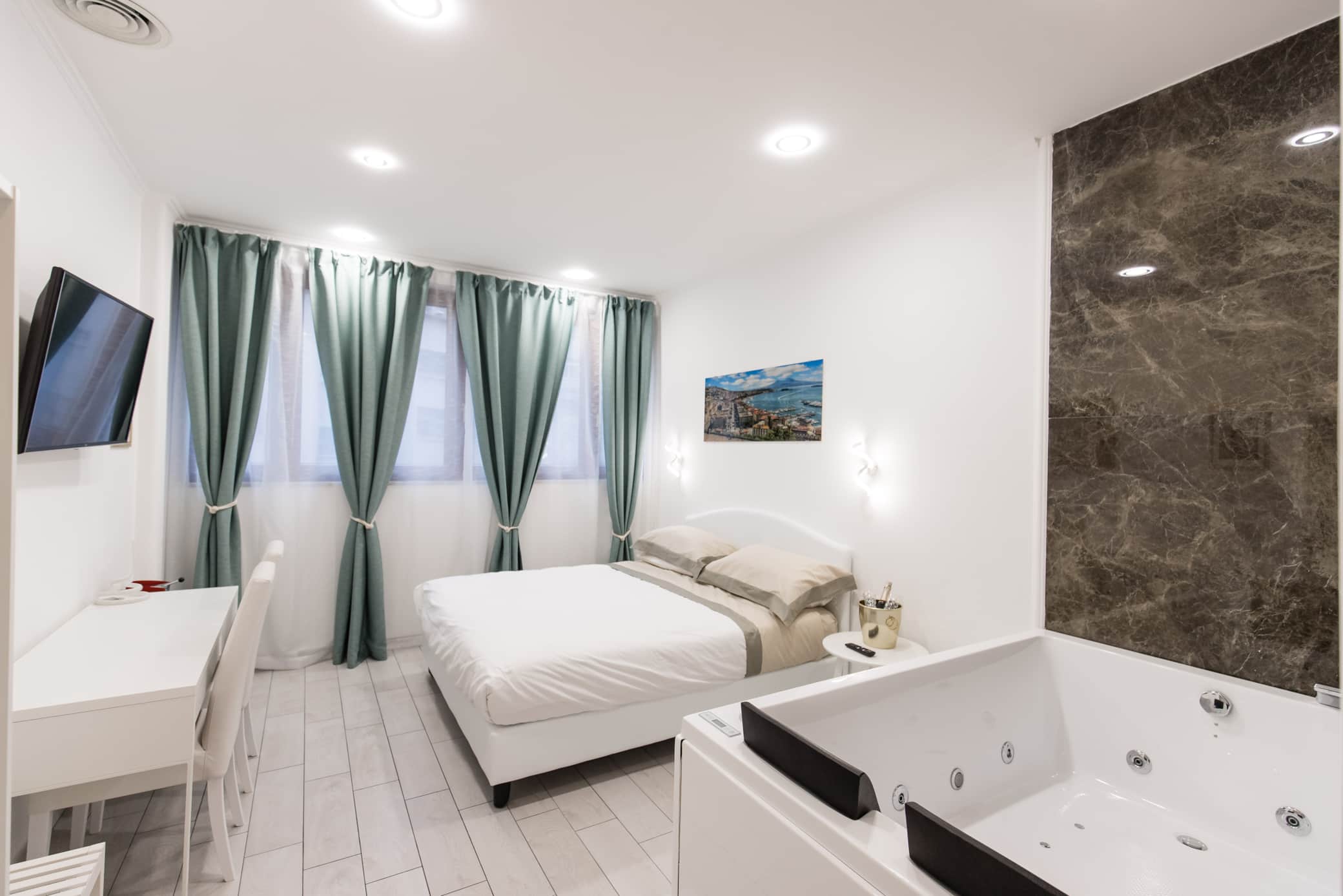 King Room con Vasca Idromassaggio in camera per 2 persone. Bagno privato completo in cameracon box doccia in roccia verde . Asciugami e federe incluse nell'alloggio con kit di cortesia. Ideale per una fuga romantica di qualche giorno nella Città di Napoli nel quartiere Chiaia/Mergellina.